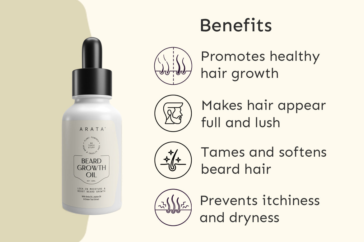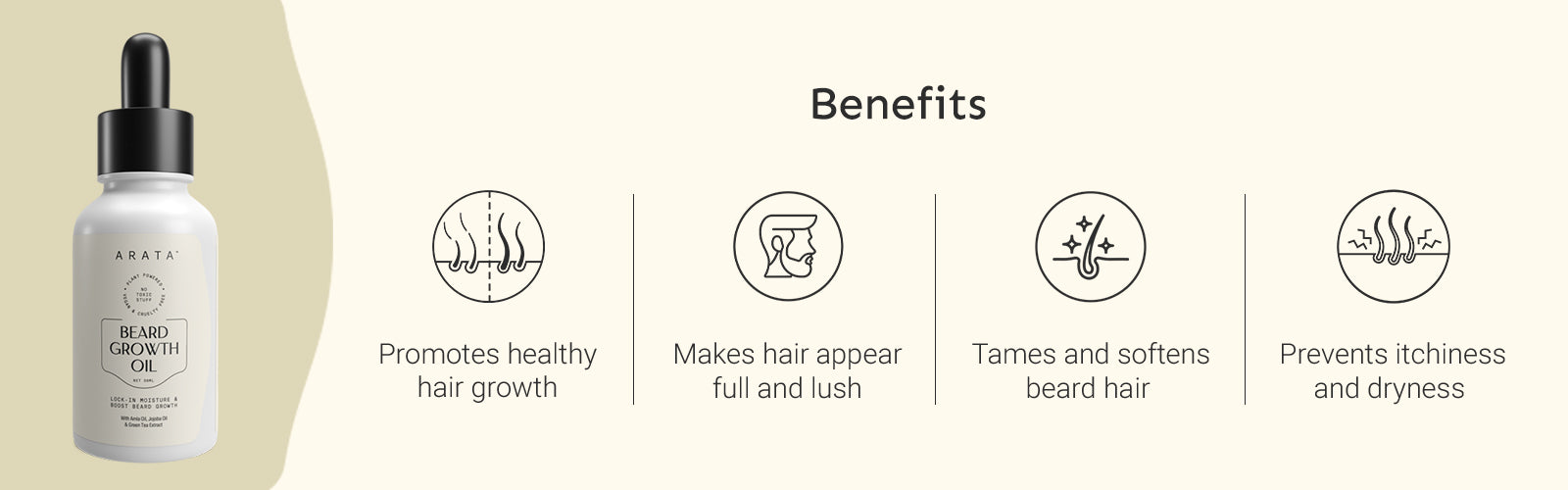 Arata beard growth oil ensures healthy hair growth making beard hair appear full and lush. It is a formulation of moisturizing oils and green tea extracts that tame frizz, soften the beard hair, and keep the beard moisturized.