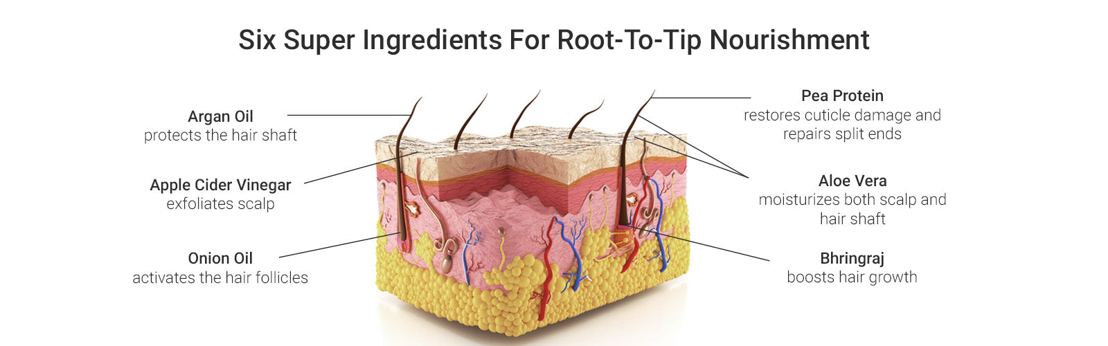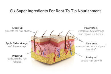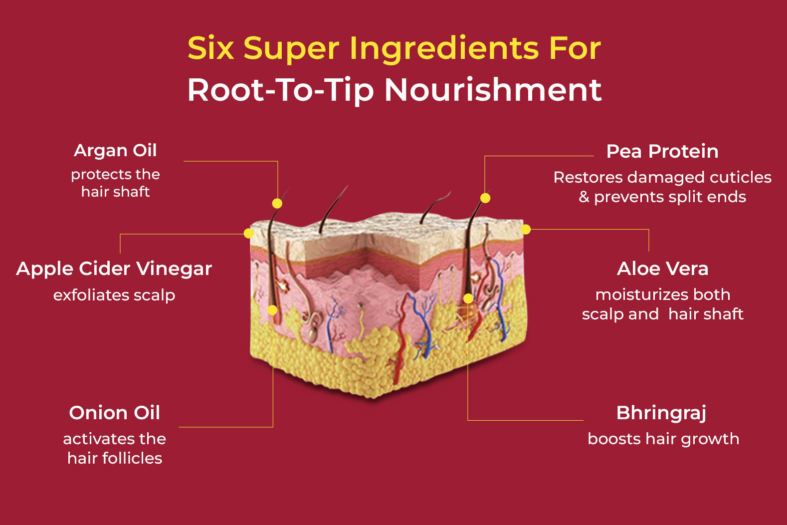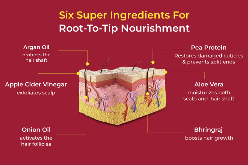 Furthermore, natural effective ingredients come together to nourish each section of your hair. Onion oil maintains the scalp pH to unclog follicles and promote hair growth. A potent exfoliator, Apple Cider Vinegar gently removes oil, dead cells, and flakes, making your hair look healthier and shinier. Argan Oil, known for its moisturizing and conditioning properties, creates a protective barrier around the hair shaft, preventing split ends and frizz while enhancing shine. Another star ingredient, Aloe vera, deeply moisturizes the scalp, regulates sebum production, and reduces greasiness, all while strengthening follicles and promoting hair growth. Lastly, Bhringraj boosts blood circulation to the roots, activates follicles, and prevents dandruff, while pea protein enhances flexibility, reduces breakage, and improves shine.