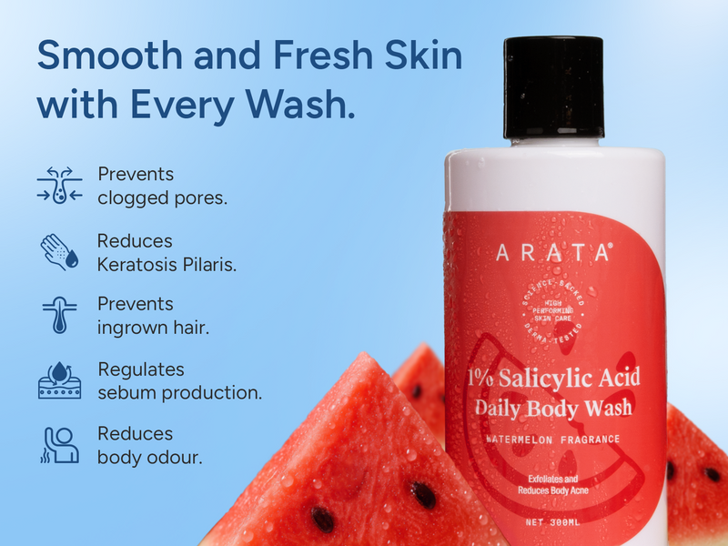 Arata's 1% Salicylic Acid Daily Body Wash is a refreshing, derma-tested formula designed to cleanse and exfoliate your skin. Infused with 1% salicylic acid, it gently exfoliates, unclogs pores, and helps reduce body acne, strawberry skin, and hyperpigmentation, leaving your skin smoother and clearer with regular use.
