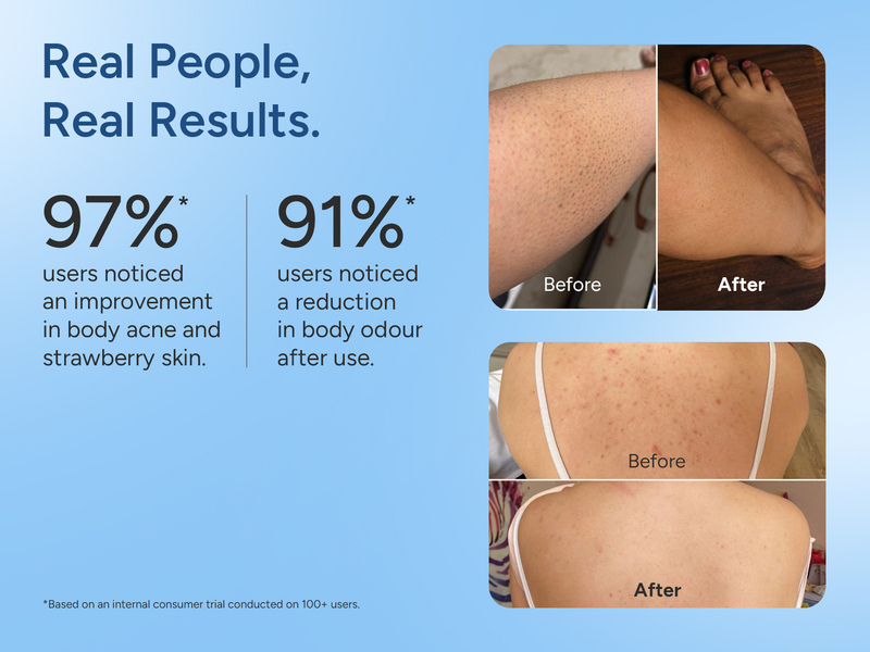 The body wash gently exfoliates the skin, unclogs pores, reduces body acne, smooths rough texture (like keratosis pilaris), helps prevent ingrown hairs, and regulates excess oil — leaving your skin feeling fresh and clean.
