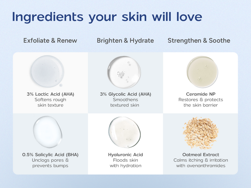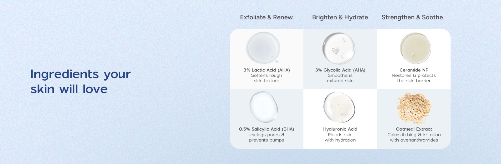 Purified Water, Glycolic Acid, Lactic Acid, Cetyl Alcohol, Cyclopentasiloxane, Glyceryl Monostearate, Propanediol, Stearic Acid, Ethyl Olivate, Sodium Hydroxide, Cetostearyl Alcohol, Emulsifying Wax, Glycerine, Niacinamide, Fragrance, Salicylic Acid, Phenoxyethanol, Olive Oil Methyl Ester, Sodium Benzoate, Potassium Sorbate, Sodium Acrylate/Sodium Acryloyldimethyl Taurate Copolymer, Polyacrylate-13, Isohexadecane, Oat (Avena sativa) Meal Extract, Citrus Grandis Fruit Extract, Sodium Gluconate, Vaccinium Angustifolium (Blueberry) Fruit Extract, Polyisobutene, Ethylhexylglycerin, Polysorbate 80, PEG-7 Glyceryl Cocoate, Polysorbate 20, Sorbitan Oleate, Sorbitan Isostearate, Sodium Hyaluronate, Ceramide NP