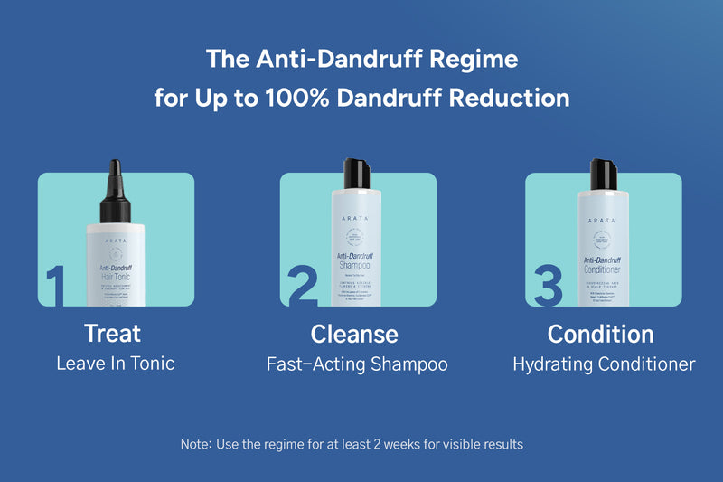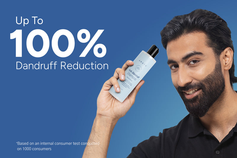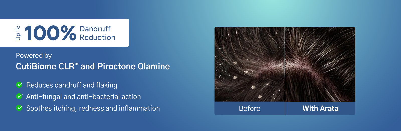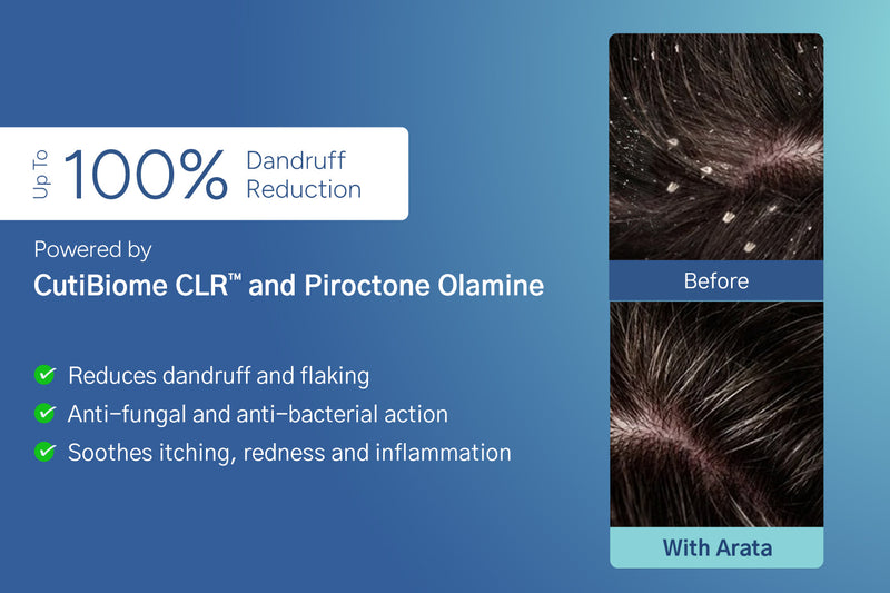 Ans. Dandruff is a common scalp condition characterised by flaky, itchy skin. It's caused by an overgrowth of a naturally occurring yeast-like fungus called Malassezia. The Arata Anti Dandruff shampoo targets this through anti-fungal actives like Piroctone Olamine, while CutiBiome CLR™ helps soothe itching and restore balance to the scalp’s natural microbiome.