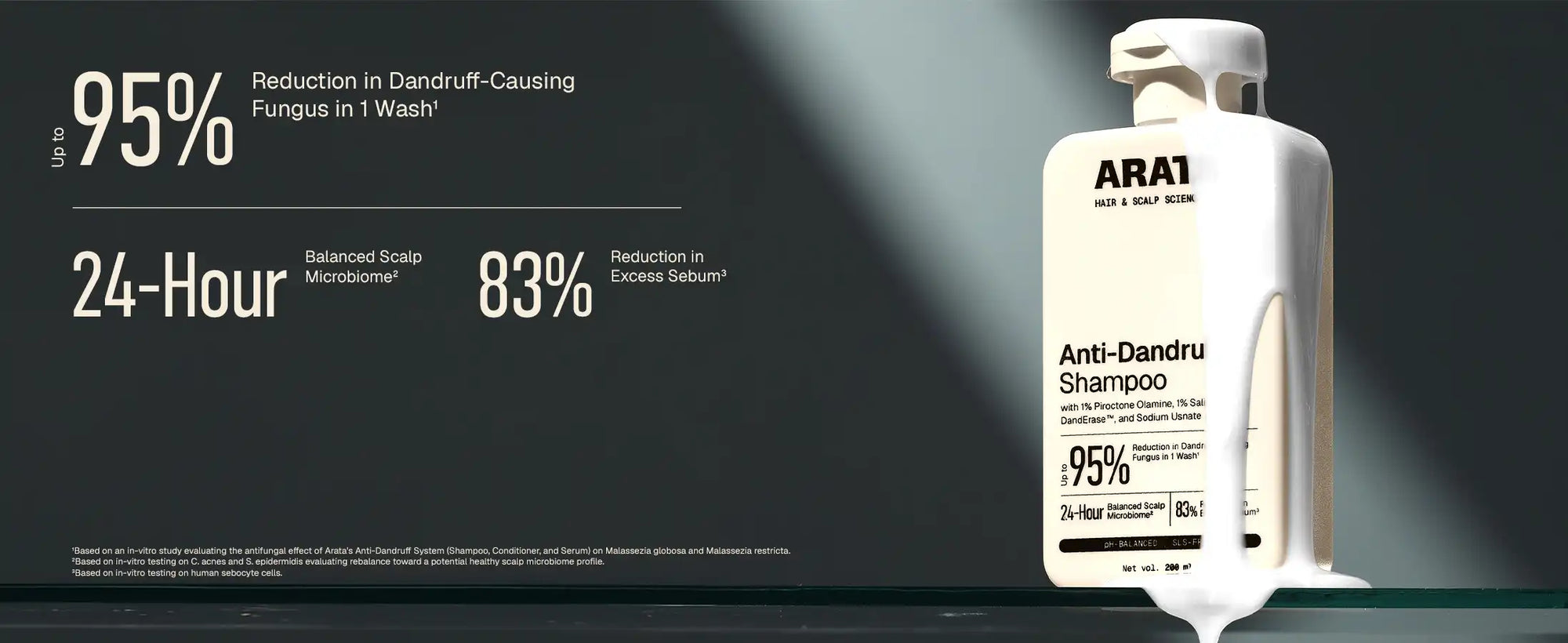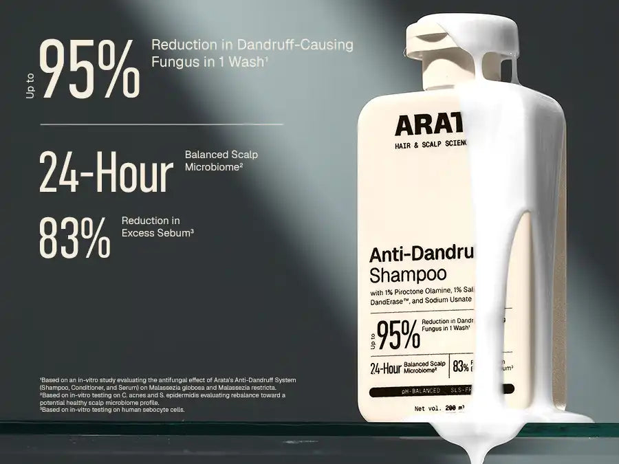 _Based on an in-vitro study evaluating the antifungal effect of Arata's Anti-Dandruff System (Shampoo, Conditioner, and Serum) on Malassezia globosa and Malassezia restricta.