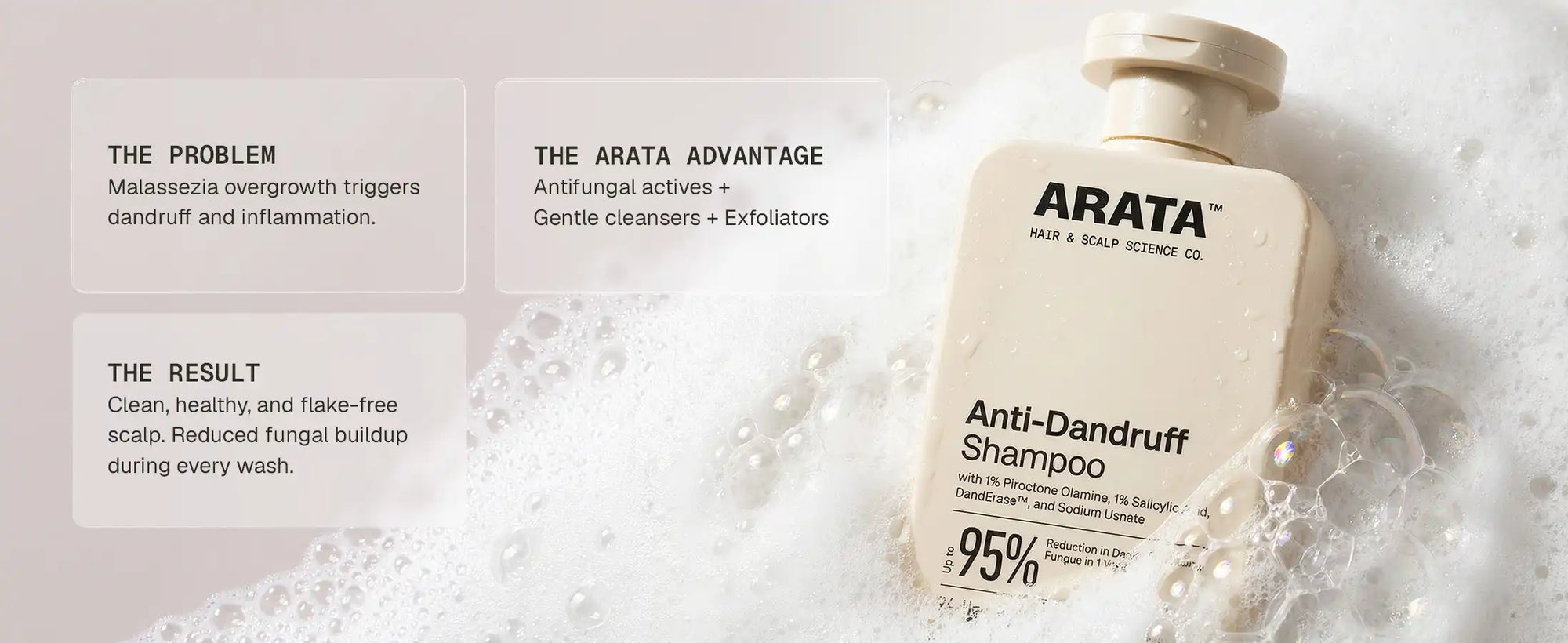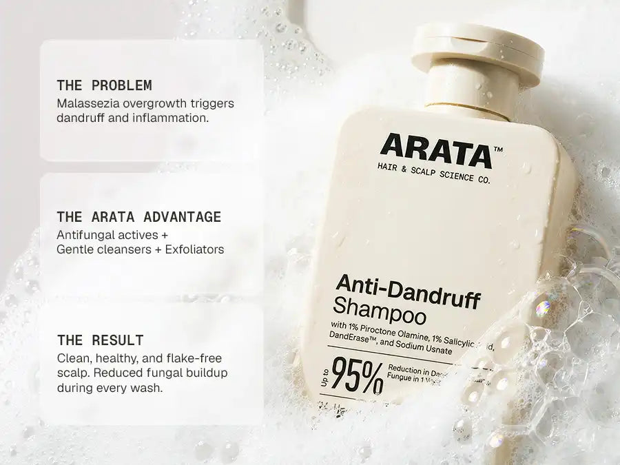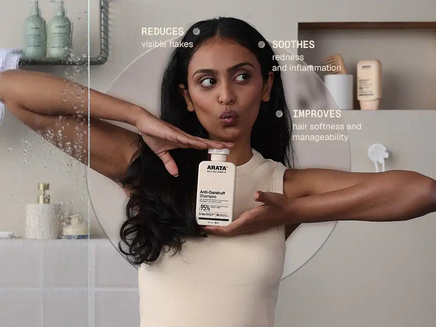 Let’s break it down: Arata Anti-Dandruff Shampoo takes a 360-degree approach to dandruff control. It helps reduce dandruff-causing fungal load, balance the scalp microbiome, and improve the overall scalp health. It does not just loosen and remove stubborn flakes from the surface but also reduces the conditions that cause them to return. As opposed to most harsh, drying shampoos, Arata Anti-Dandruff Shampoo contains conditioning agents that keep your scalp and hair hydrated.