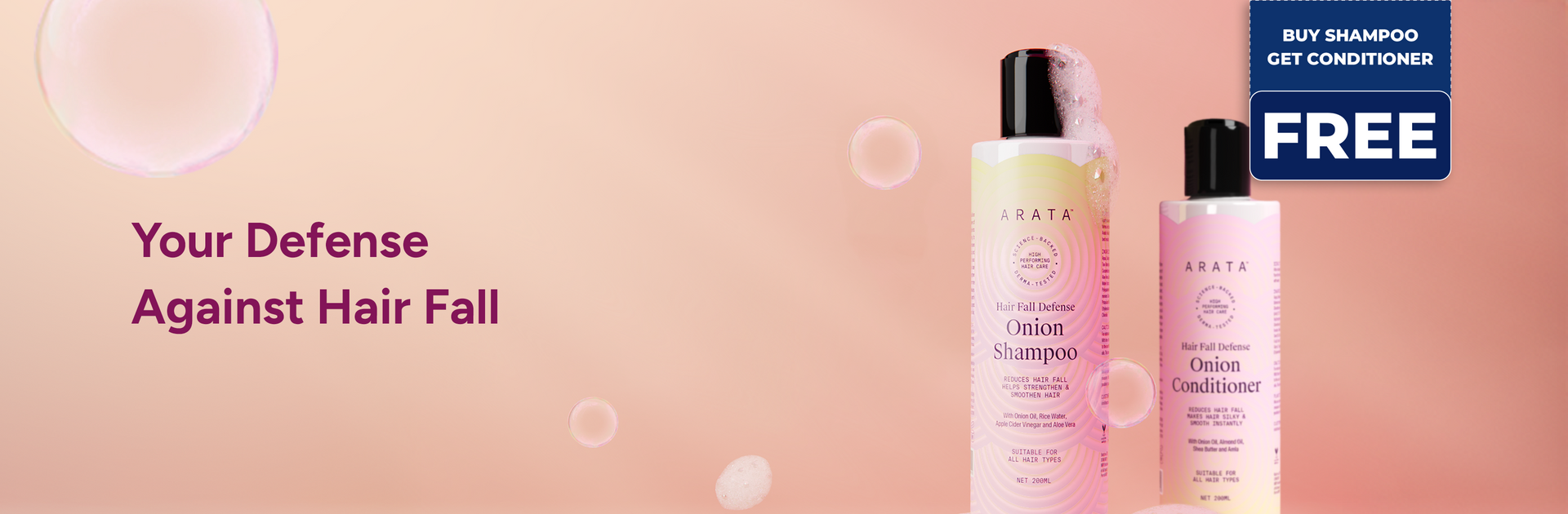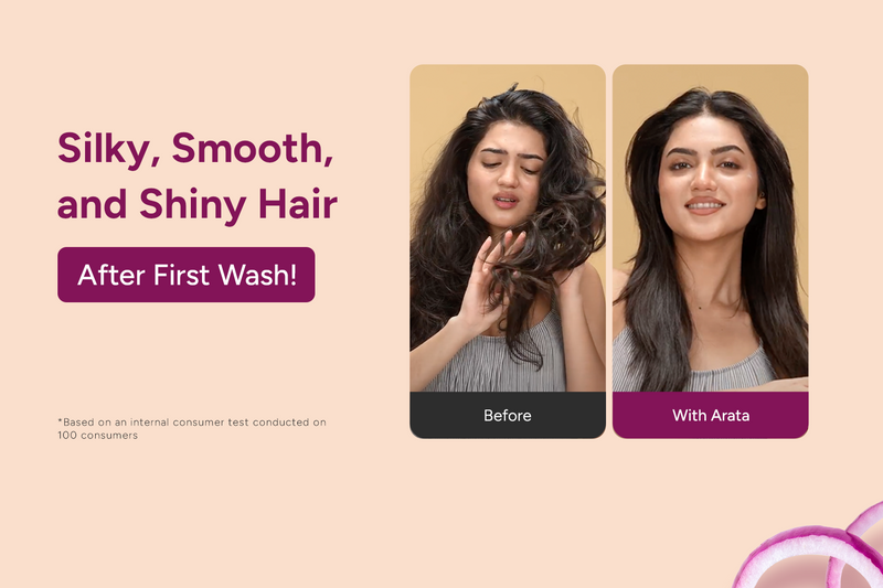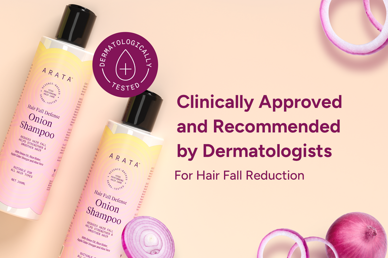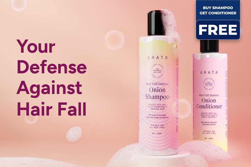 The Arata Hair Fall Defense Onion Combo prevents hair fall and makes your hair silky, smooth, and shiny instantly. It's powered by high-performing ingredients like onion oil, rice water, amla, and shea butter that nourish the follicles, reduce breakage, and deeply moisturise your hair.