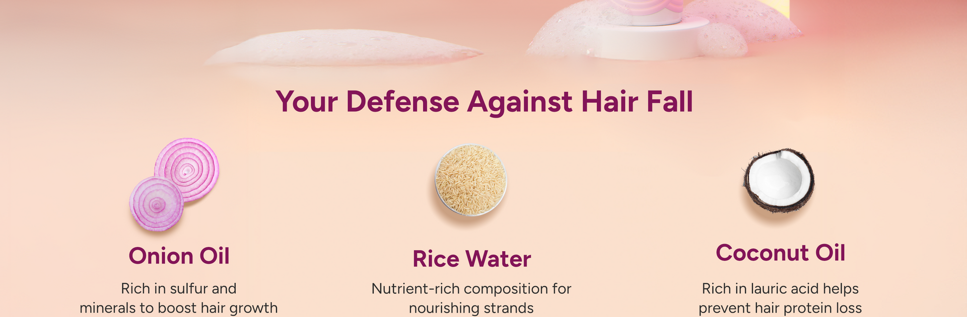 Aqua, Dimethiconol, Tea-Dodecylbenzenesulfon - ate, Cocamidopropyl Betaine, Vegetable Glycerin, Aloe Vera Extract, Onion Seed Oil Extract, Rice Water Extract, Apple Cider Vinegar Extract, Polyquaternium-7, Guar Hydroxypropyltrimonium Chloride, Fragrance, Sodium Benzoate, Potassium Sorbate, Acetic Acid, Ethylenediaminetetraacetic Acid, Sodium Chloride, Cetostearyl Alcohol, Behentrimonium Chloride, Vegetable Glycerine, C12-15 Alketh-2 (and) Sweet Almond Oil, Coconut Oil, Argan Oil, Shea Butter, Amla Fruit Extract, Phenoxyethanol and Triethylene Glycol, D-Panthenol, Sodium Laureth Sulfate