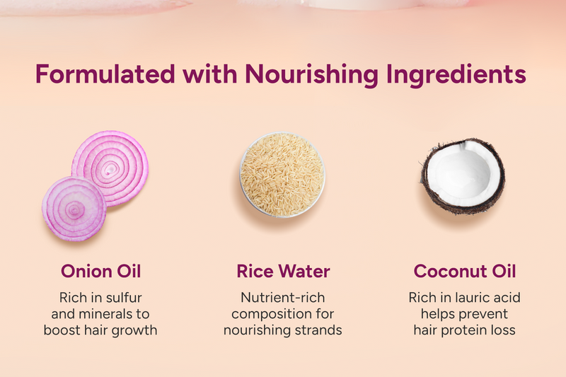 Its star ingredient, onion oil, has been scientifically proven to stimulate hair follicles to reduce hair loss, boost hair growth, and promote thicker hair. Added with rice water and aloe vera, our shampoo further strengthens and conditions your hair, making it resilient and less prone to breakage. Apple cider vinegar promotes a healthy environment for hair growth by exfoliating the scalp and removing build-up.