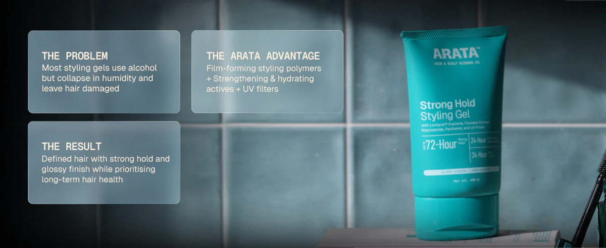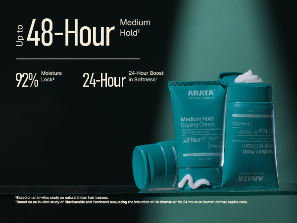 Arata Medium Hold Styling Cream integrates high-performance styling polymers with proven, hair-beneficial actives. Powered by Luviquat¨ Supreme, it delivers up to 48-hour medium hold_ and 24-hour softness boost_. Its advanced multi-polymer system forms a flexible, humidity-resistant film that keeps hair shaped and defined without stiffness or crunch. This means it styles your hair without compromising natural movement, so your look stays natural and touchable. At the same time, strengthening and hydrating actives help improve hair elasticity, reduce breakage from repeated styling, and maintain moisture balance, supporting healthier hair with repeated use. It is also infused with UV filters to help protect against sun-induced damage and colour fading.Ê