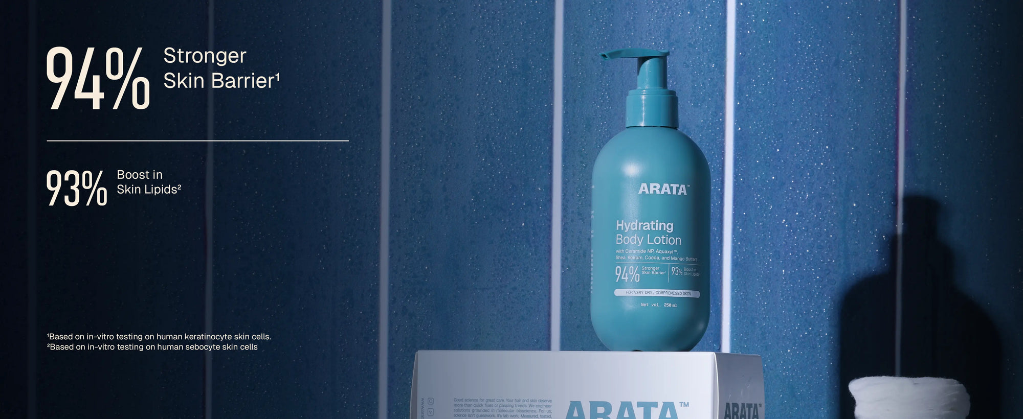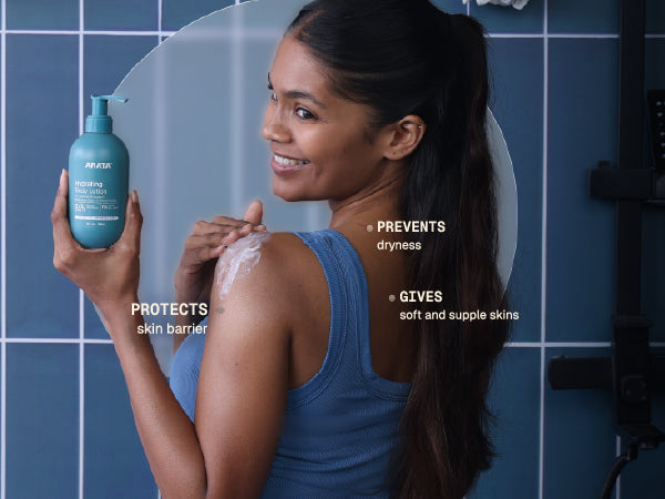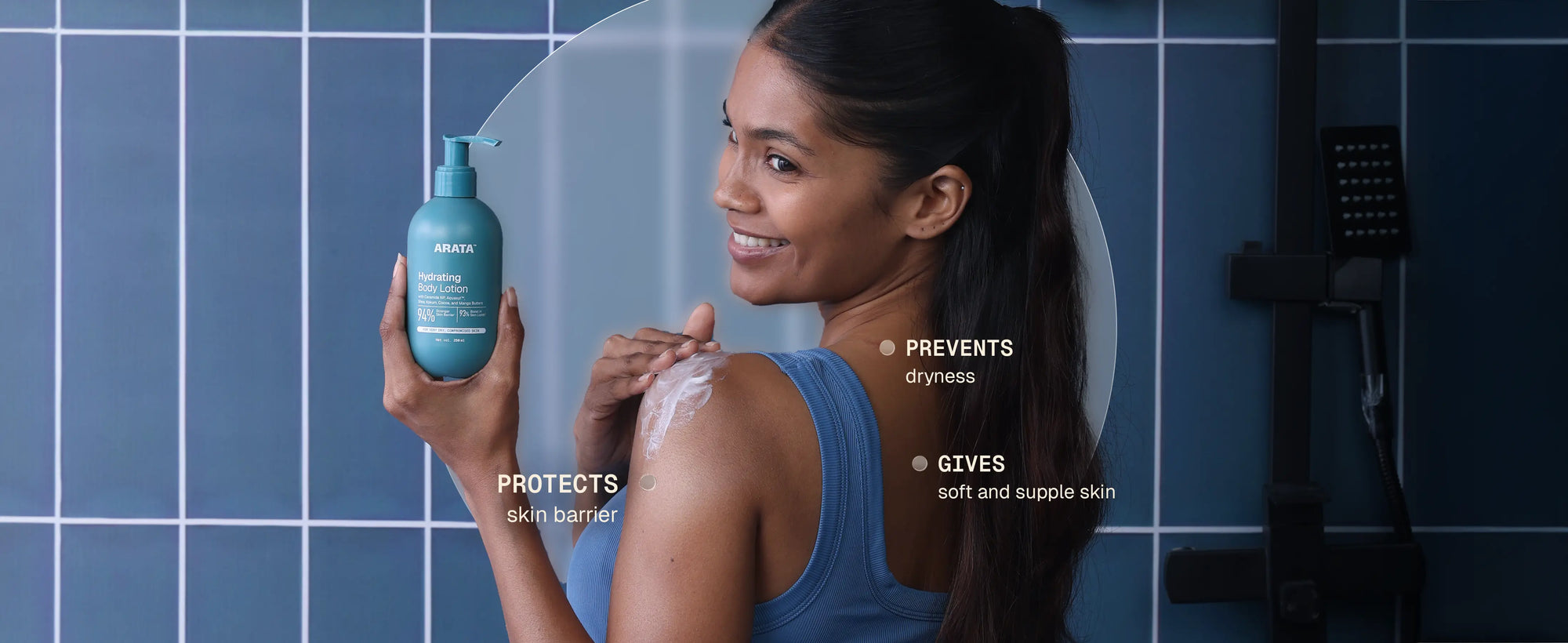 Let’s break it down: The Arata Hydrating Body Lotion is designed with the Indian climate in mind, making it ideal for every weather condition. Its rich, creamy, ceramide-led formula helps your skin hold on to moisture. At the same time, it is lightweight, non-greasy, and quick-absorbing. This blend of rich hydration and a weightless texture makes it ideal for all climates and weather conditions.
