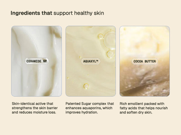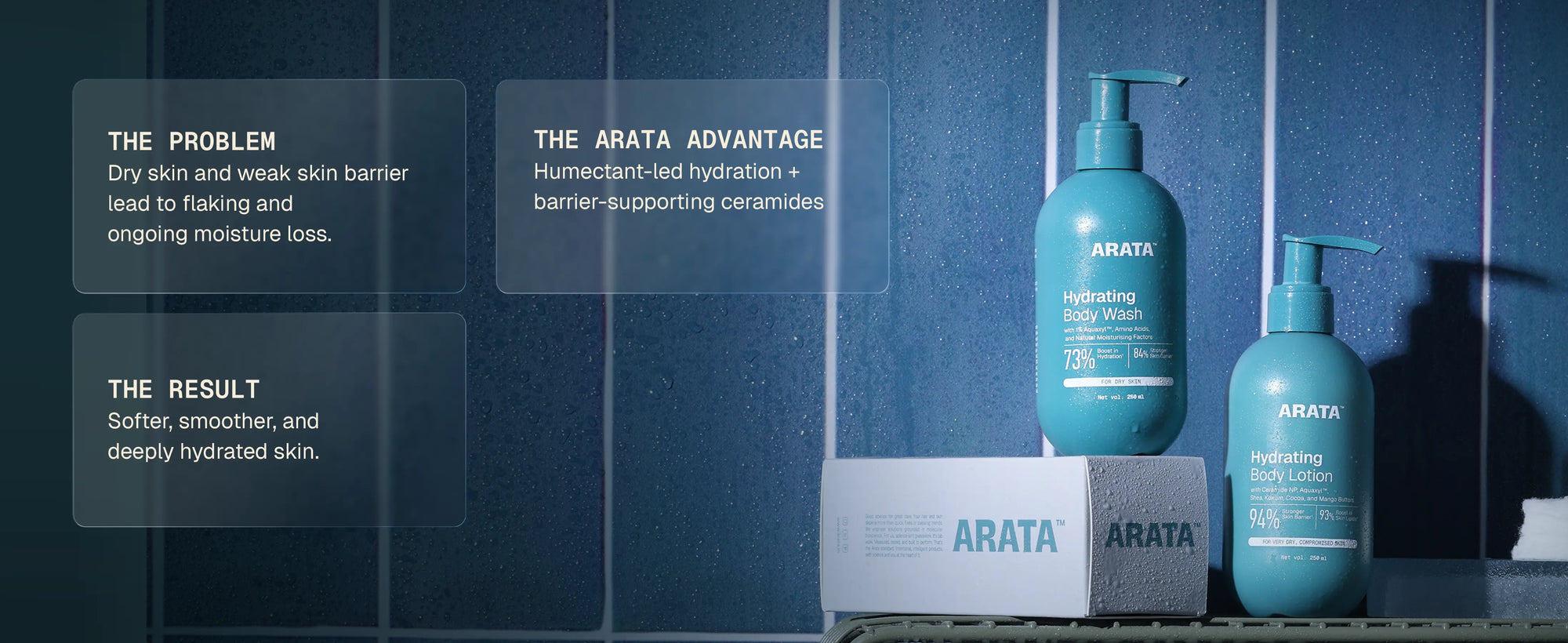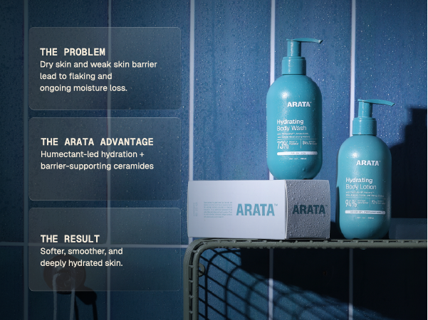 Arata Hydrating Body Lotion is formulated to support dry skin through multiple hydration mechanisms. With humectants to attract water, nourishing butters to soften and smooth, and barrier-supporting actives like Ceramide NP and Aquaxyl™, it helps restore moisture, strengthen the skin barrier, and improve the skin’s ability to hold hydration over time.
