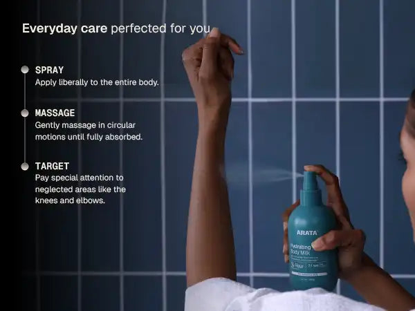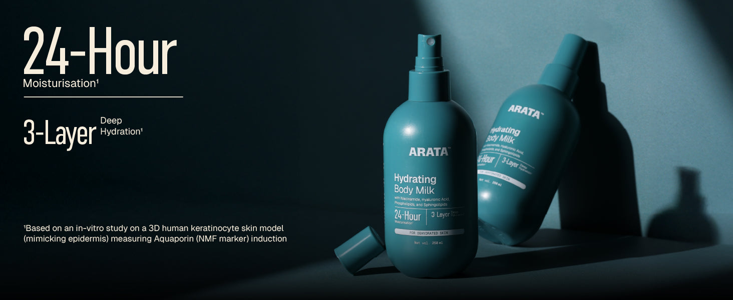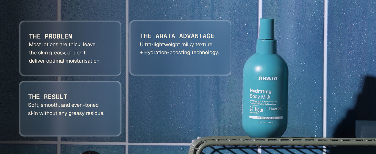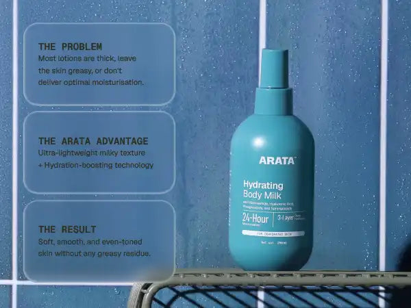 Let’s break it down: Whether you’re dealing with heat, humidity, pollution, or long hours under the AC, the Arata Hydrating Body Milk is designed to keep up. It delivers long-lasting hydration while its lightweight formula absorbs quickly, with no heaviness or greasy feel, making it easy to wear even in tropical climates.