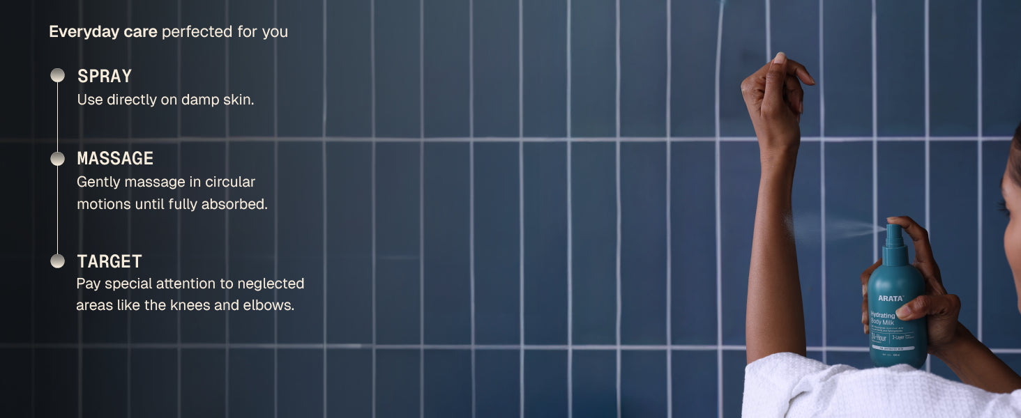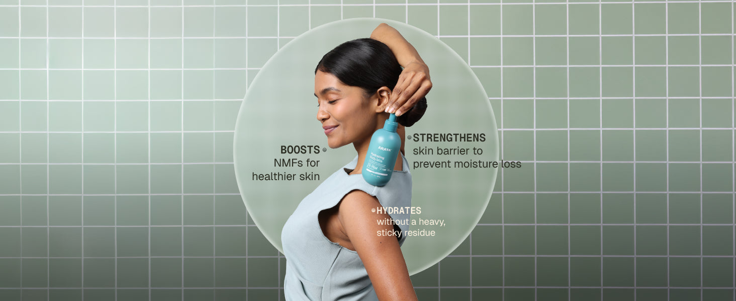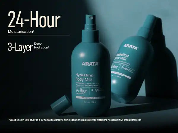 Let’s break it down: Arata Hydrating Body Milk helps repair and strengthen the skin barrier so moisture stays in and dryness doesn’t sneak back in. Infused with niacinamide, it also works on dullness and uneven skin tone, helping skin look clearer and more even over time.