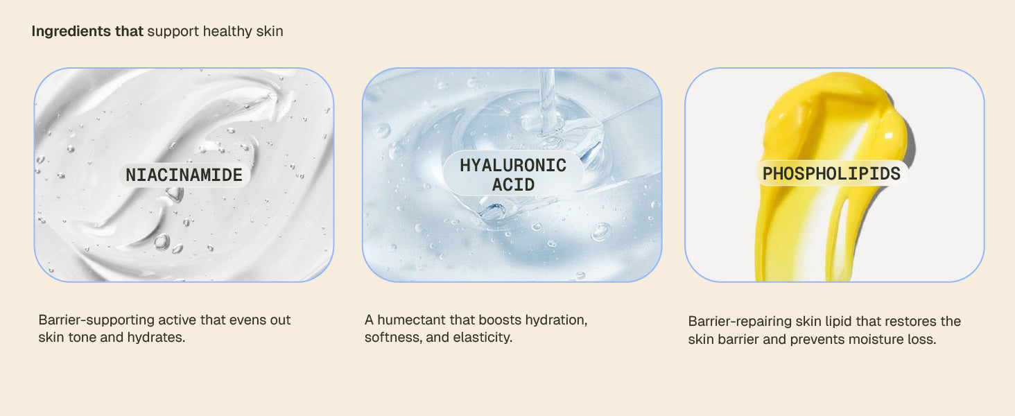 Niacinamide, Hyaluronic Acid, Phospholipids, Sphingolipids, Coconut Oil, Shea Butter, Lactic Acid, Salicylic Acid