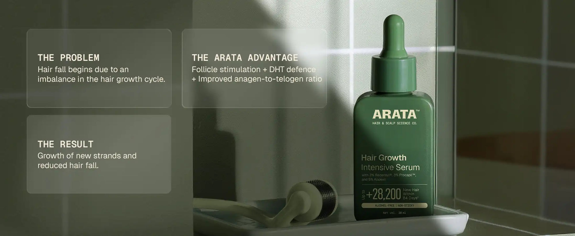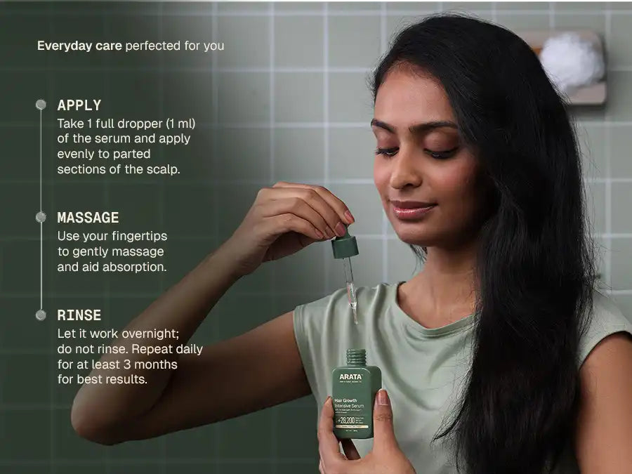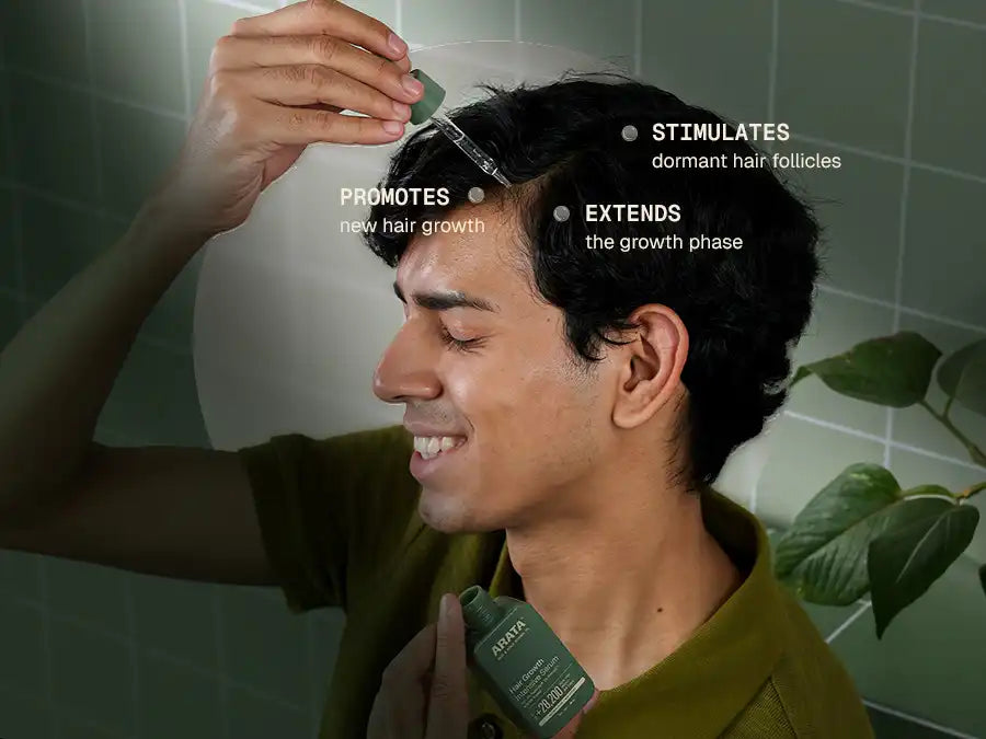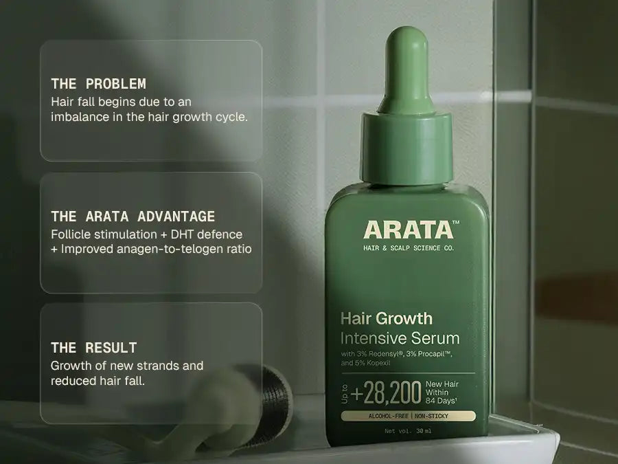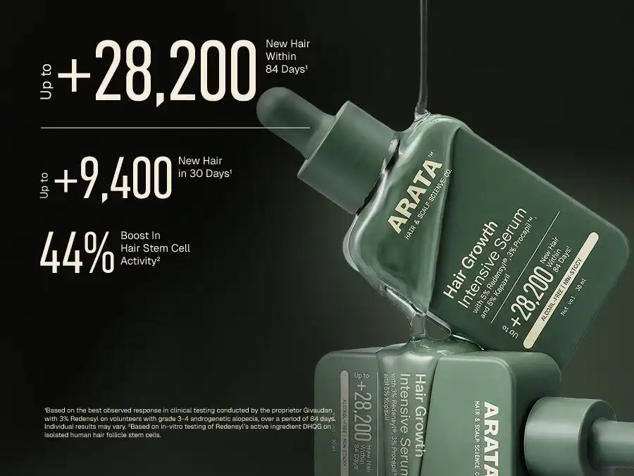 Arata Hair Growth Intensive Serum is designed to work at the scalp level, where hair growth begins. Its multi-active formula targets the hair growth cycle across stages. Clinically studied actives like 3% Redensyl help reactivate dormant hair follicle stem cells, while 3% Procapil helps limit the impact of DHT, a key contributor to hair fall. 5% Kopexil supports the anagen (growth) phase by strengthening how hair is anchored at the scalp, helping reduce premature shedding.