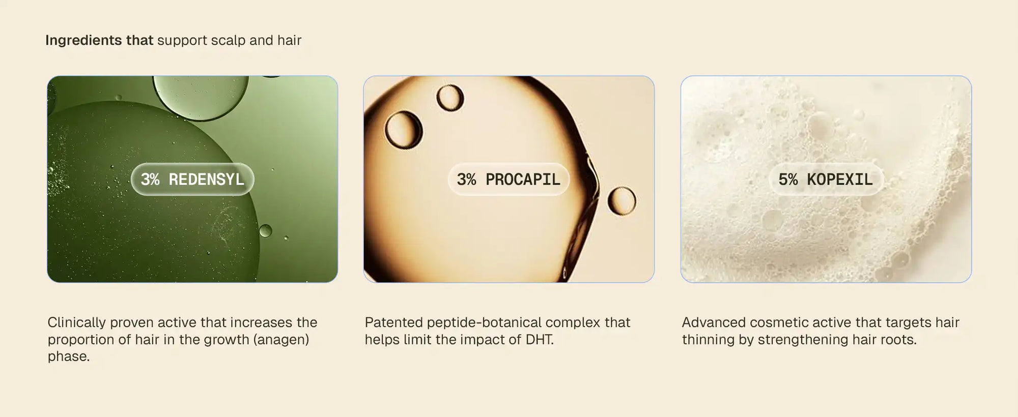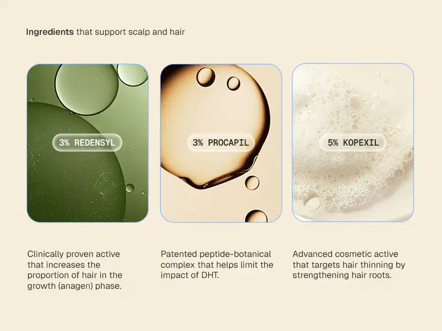 3% REDENSYL: Reactivates dormant hair follicle stem cells to support new hair growth and improve follicle activity over time.