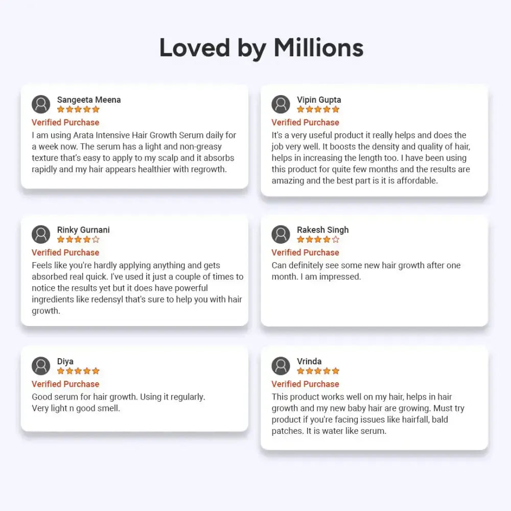 Arata's Intensive Hair Growth Serum is a powerful formula combining science-backed, clinically proven ingredients like 3% Redensyl, 3% Procapil, and 5% Kopexil, alongside natural boosters such as rice water, onion, turmeric, caffeine, and amla. With consistent use, you can expect hair regrowth in 90 days*.