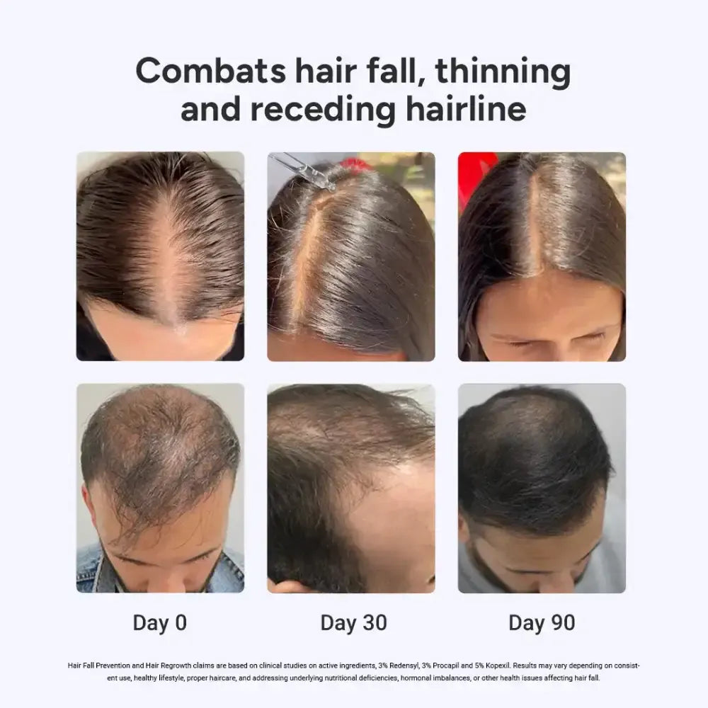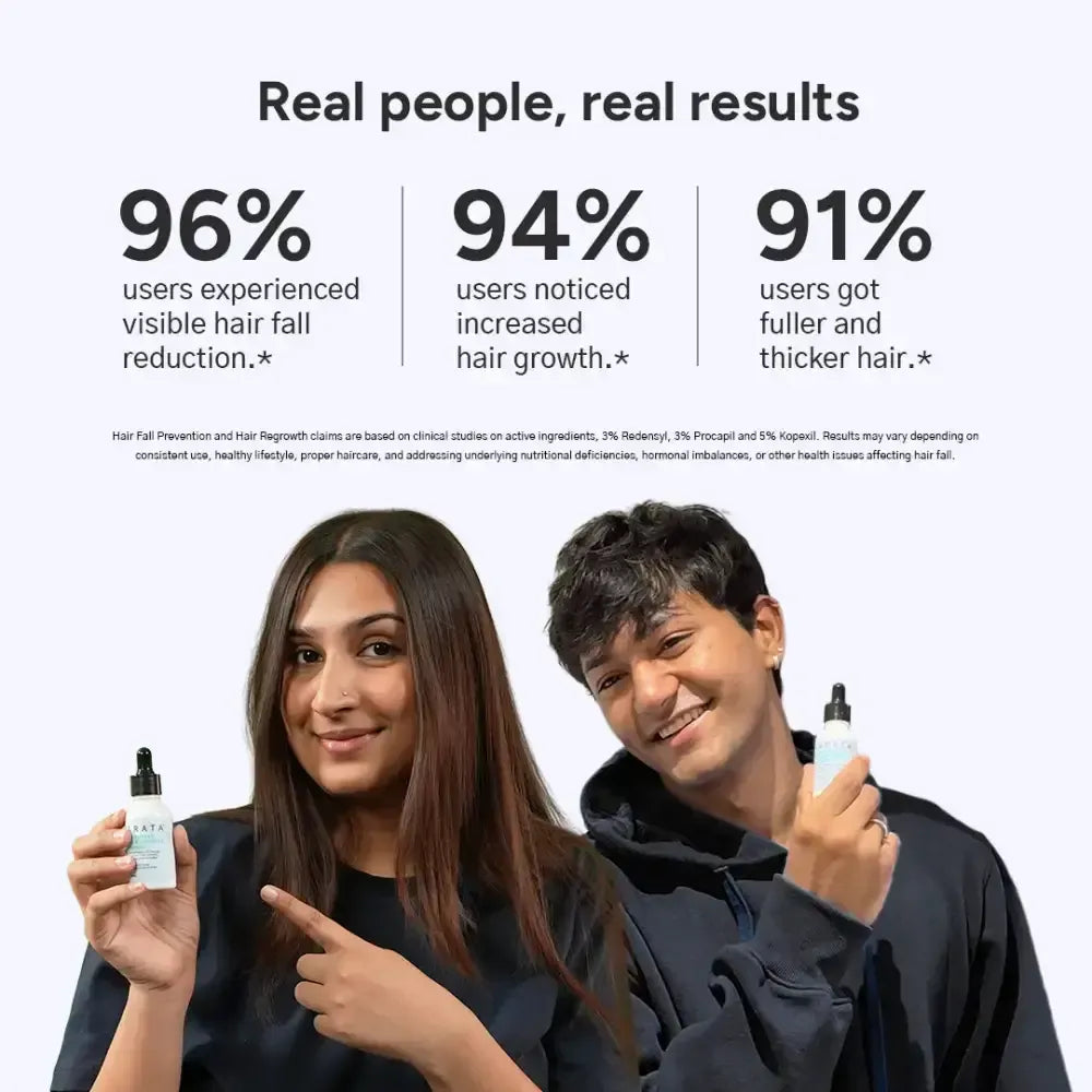 *Hair fall prevention and hair regrowth claims are based on clinical studies on active ingredients, 3% Redensyl, 3% Procapil and 5% Kopexil. Results may vary depending on consistent use, healthy lifestyle, proper haircare, and addressing underlying nutritional deficiencies, hormonal imbalances, or other health issues affecting hair fall.