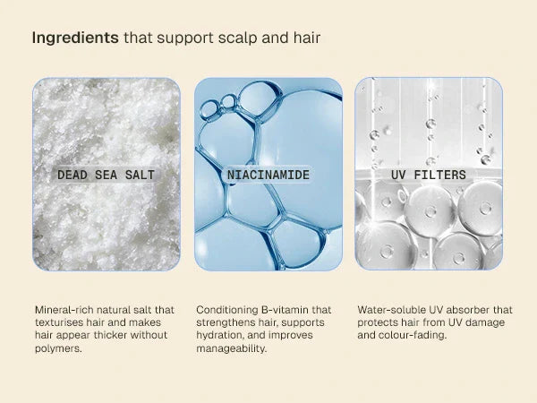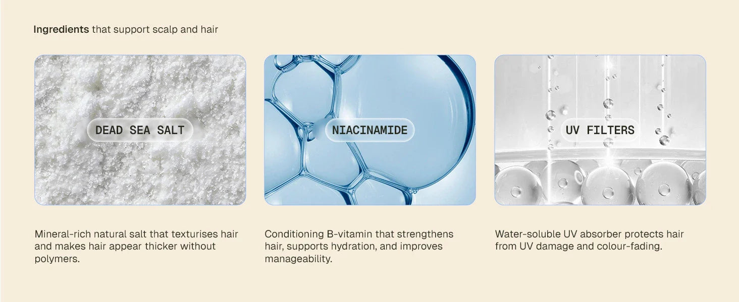 Unlike traditional sea salt sprays that can be overly drying, this formula is infused with sodium aspartate and panthenol and niacinamide complex. Together, they help support moisture retention, elasticity, and cuticle resilience, reducing brittleness with repeated use.