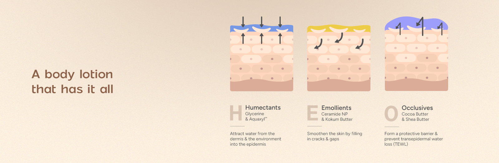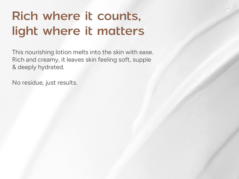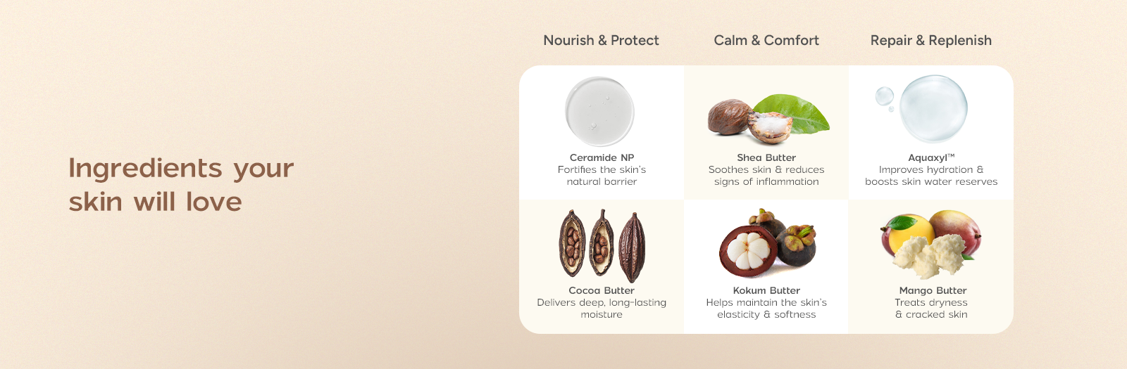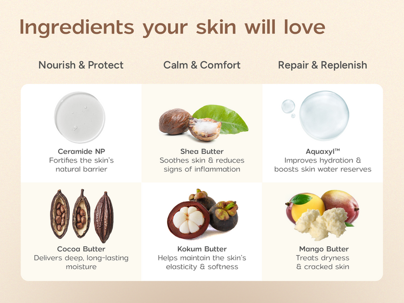 It helps lock in moisture and minimise transepidermal water loss (TEWL). A potent blend of shea, cocoa, kokum, and mango butters delivers lasting hydration and comfort, leaving skin feeling soothed, supple, and intensely cared for all day.