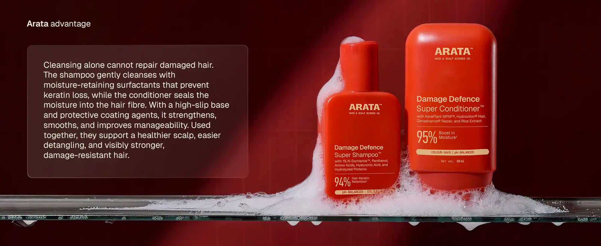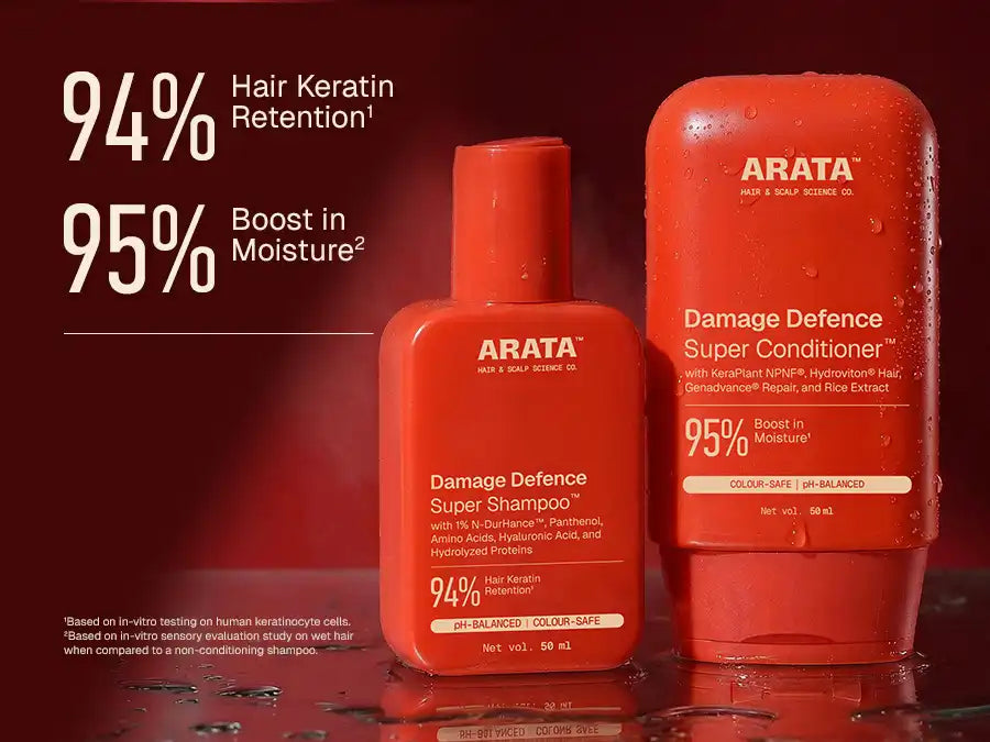 Arata Damage Defence Shampoo & Conditioner Duo is designed to do both. Arata Damage Defence Super Shampooª is a gentle, sulphate-free formula that cleanses without over-stripping, helping retain 94% of hair keratin_ during washing. Infused with conditioning polymers and repair actives, it selectively deposits across damaged areas to smooth lifted cuticles and preserve the hairÕs protective surface.