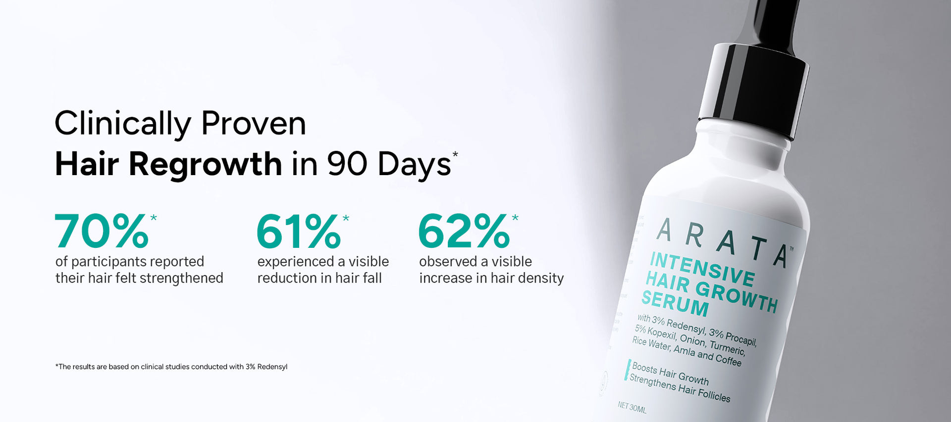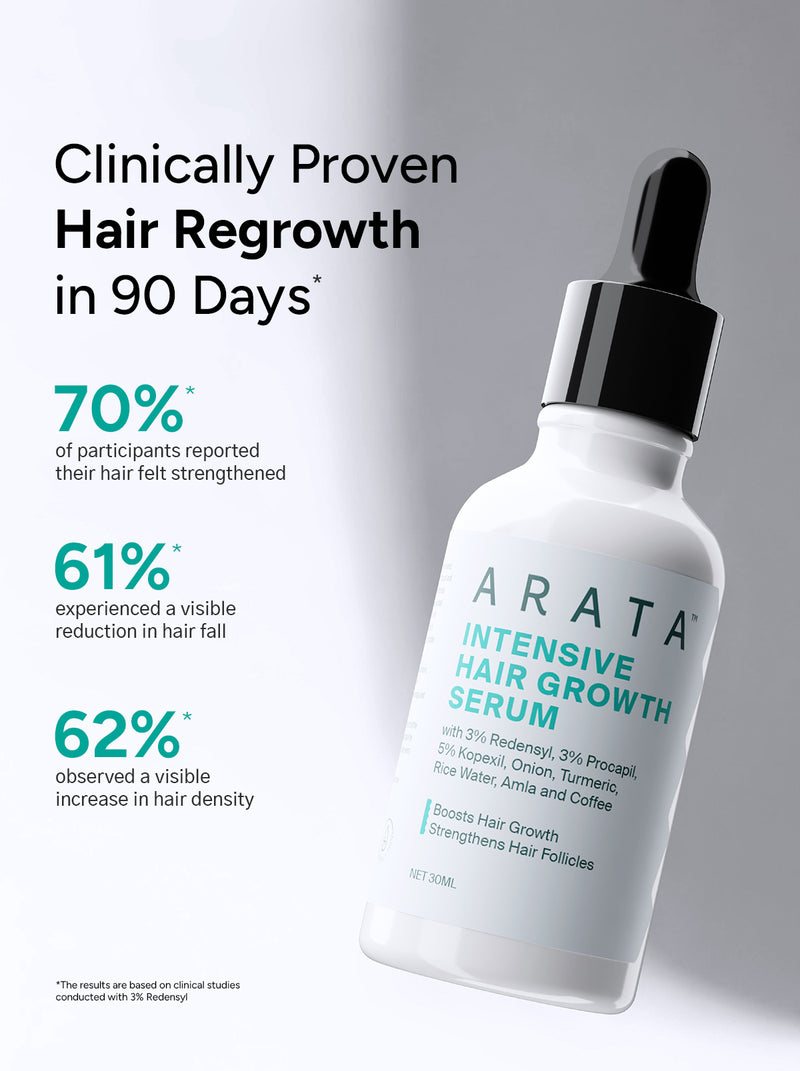 Arata's Intensive Hair Growth Serum is a powerful formula that combines science-backed, clinically proven ingredients, including 3% Redensyl, 3% Procapil, and 5% Kopexil, with natural boosters such as rice water, onion, turmeric, caffeine, and amla. With consistent use, you can expect to see hair regrowth in approximately 90 days*.
