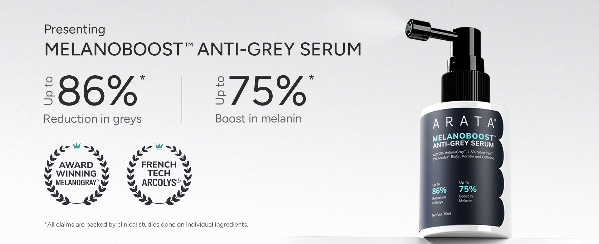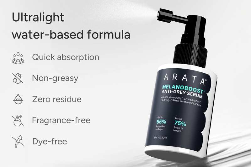 Arata MelanoBoost™ Anti-Grey Serum is a dye-free formula, clinically backed to reduce greys by up to 86% and boost melanin by 75%, restoring natural pigmentation while strengthening hair and beard. Formulated with 2% MelanoGray™, 1.5% Silverfree™, and 1% Arcolys®, it works at the root level to reactivate melanin production, protect against oxidative stress, and delay premature greying. MelanoGray™ boosts melanin synthesis to restore hair colour, Silverfree™ reduces hydrogen peroxide buildup that causes greying, and Arcolys® enhances scalp comfort while improving hair’s natural pigment.