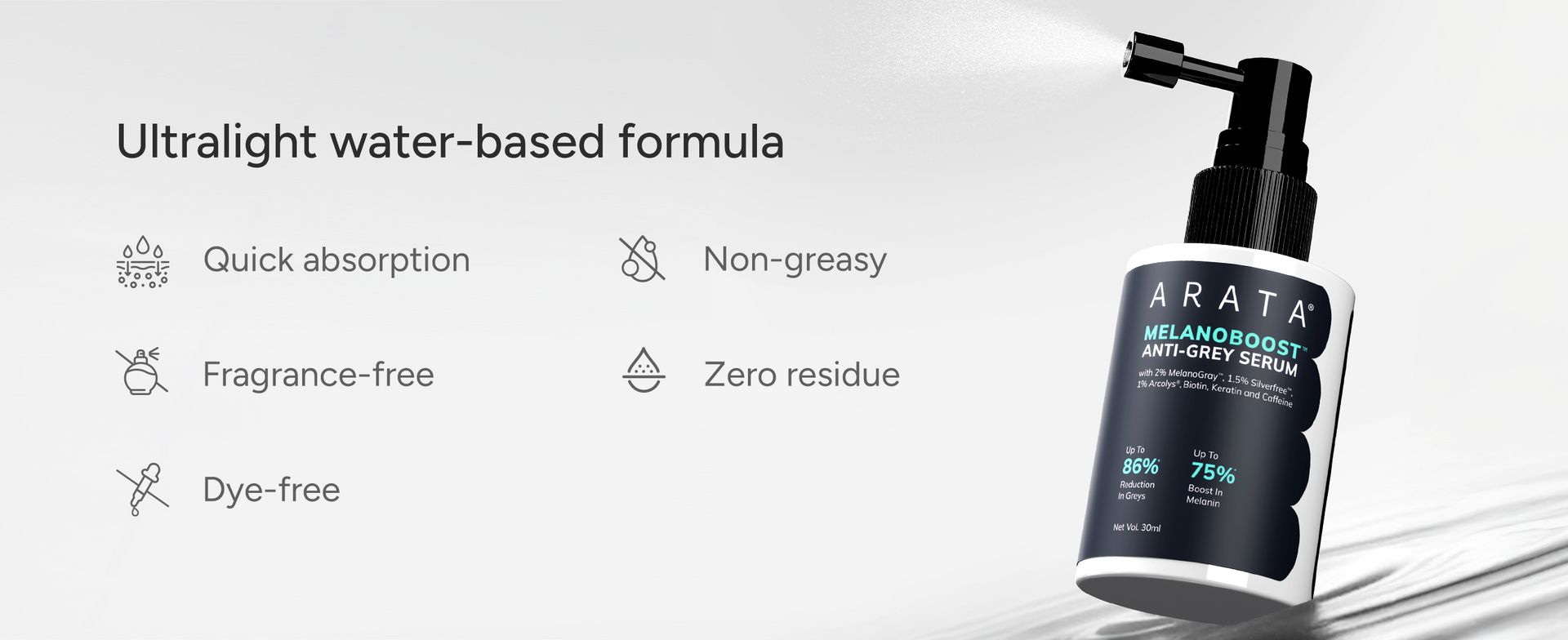 Arata MelanoBoost™ Anti-Grey Serum is a dye-free formula, clinically backed to reduce greys by up to 86% and boost melanin by 75%, restoring natural pigmentation while strengthening hair and beard. Formulated with 2% MelanoGray™, 1.5% Silverfree™, and 1% Arcolys®, it works at the root level to reactivate melanin production, protect against oxidative stress, and delay premature greying. MelanoGray™ boosts melanin synthesis to restore hair colour, Silverfree™ reduces hydrogen peroxide buildup that causes greying, and Arcolys® enhances scalp comfort while improving hair’s natural pigment.